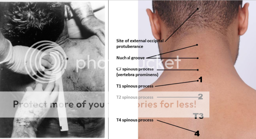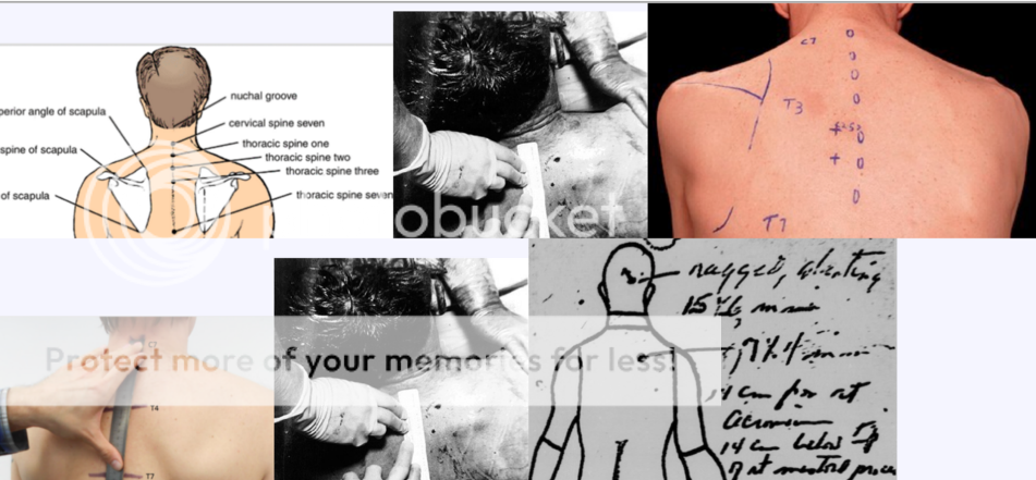 After looking at this for several days I am satisfied that T3 is accurate based on several diagram comparisons. It also makes sense that Humes & Company told Dr. Burkley this location which is why he put it on JFK's death certificate. His neck was scrunched backward giving the appearance of being higher than it actually was, but even so, it can't be any higher than T2.